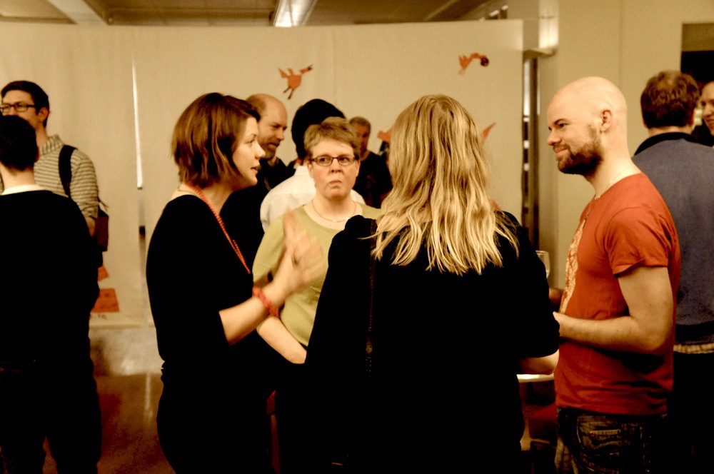 19.00-19.30. Närmare 50 personer dykte upp, registrerade sig, fick dekalark och minglade med lite glögg, vin och tilltugg.